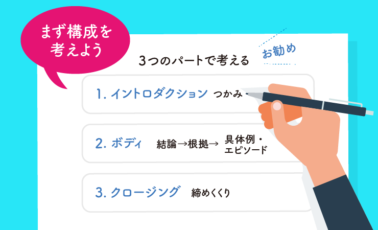 重要なのは、プレゼン用の資料を作るには、いきなりプレゼン作成用ソフトに向かい書き始めたり、見た目のデザインから入ったりするのではなく、伝えたい内容の構成を先に考えるとよい。例えば、次の3つのパートを具体的に考えることをお勧めする。これをやれば資料のデザインもシンプルにすることができ、聞き手に伝わりやすくなる。簡単に言うと引き締まった資料になるのである。