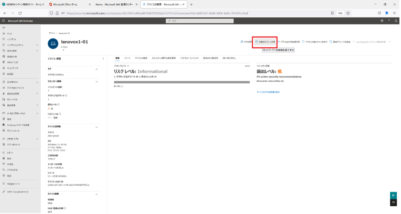 - ネットワーク分離が成功していると、デバイスアクションの画面の「デバイスの分離」アクションが、「分離からリースリする」に表示が変わります。