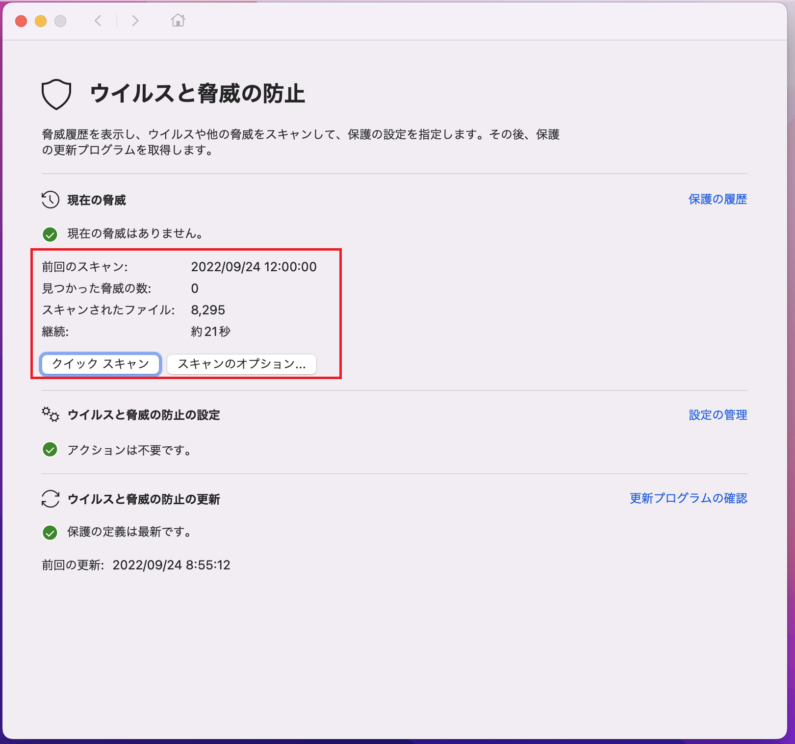 macOS 用の Microsoft Defender 既定の動作では、定期的なクイックスキャンまたは、フルスキャンの実行は行われない動作になります。