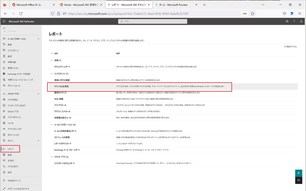 3.セキュリティセンターの「レポート」-「デバイスの正常性」に移動します。