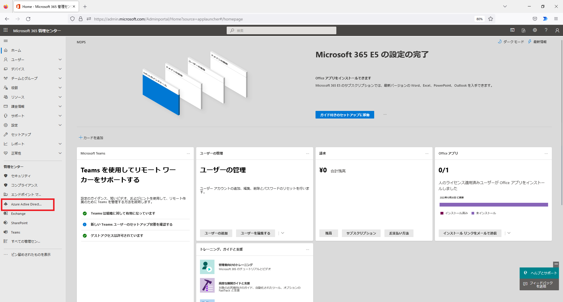 1.Microsoft 365 管理センターの管理画面( https://admin.microsoft.com )に、全体管理者権限を持つユーザーでアクセスします。
