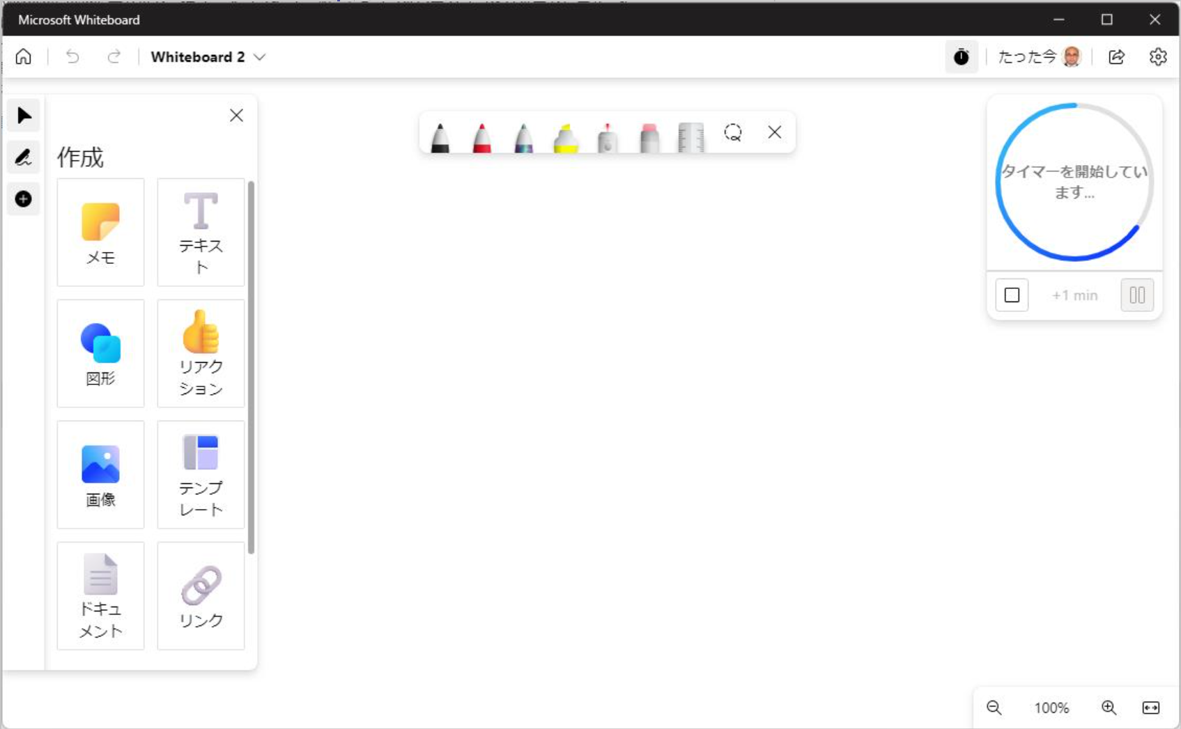 なんとなく使っていてふと気づいたのですが、Microsoft Whiteboard にタイマー機能が追加されていますね。