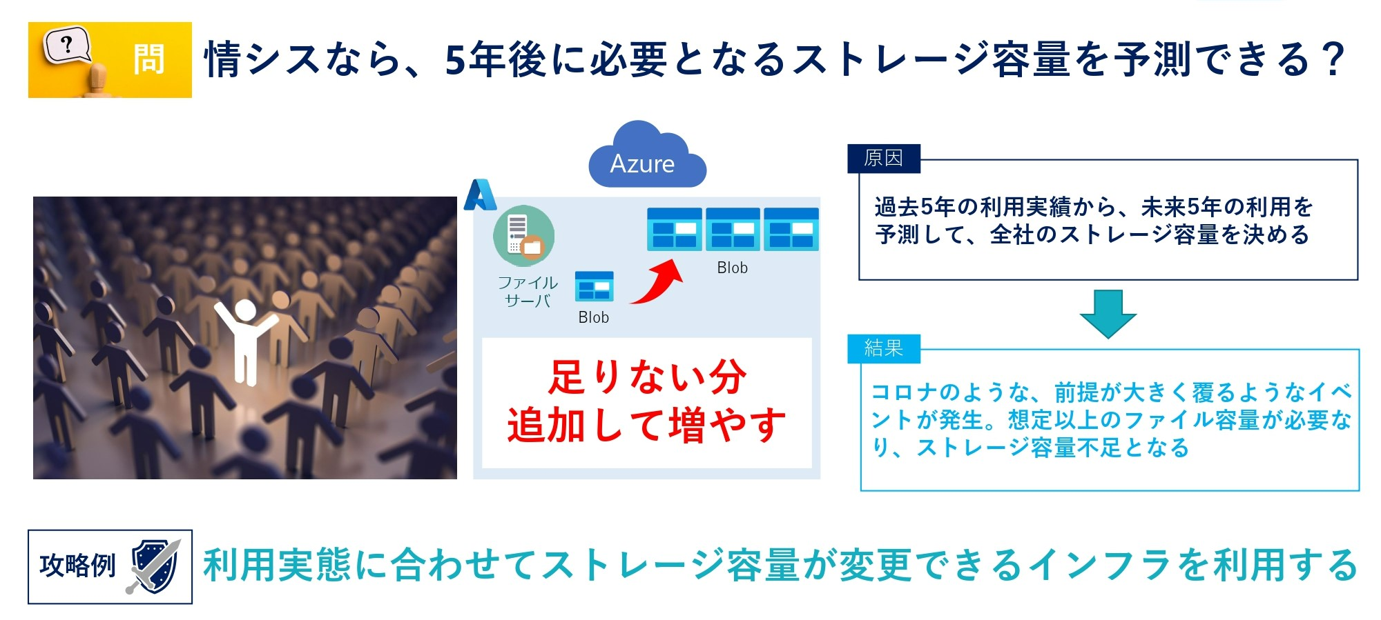 ファイルサーバーでは、ストレージ容量を柔軟に増やせないことも悩みのタネの1つです。サーバースペックと同様に、数年先を予測してあらかじめ容量を決めることは困難でしょう。コロナ禍でそうだったように、ファイルサーバーの使い方が変わるかもしれません。例えば、最近では動画や画像データの保存が増えていますが、これを過去のリプレイス時に予測することは難しかったはずです。とはいえ、あらかじめ潤沢な容量のストレージを用意しておくことは費用面で現実的ではありません。