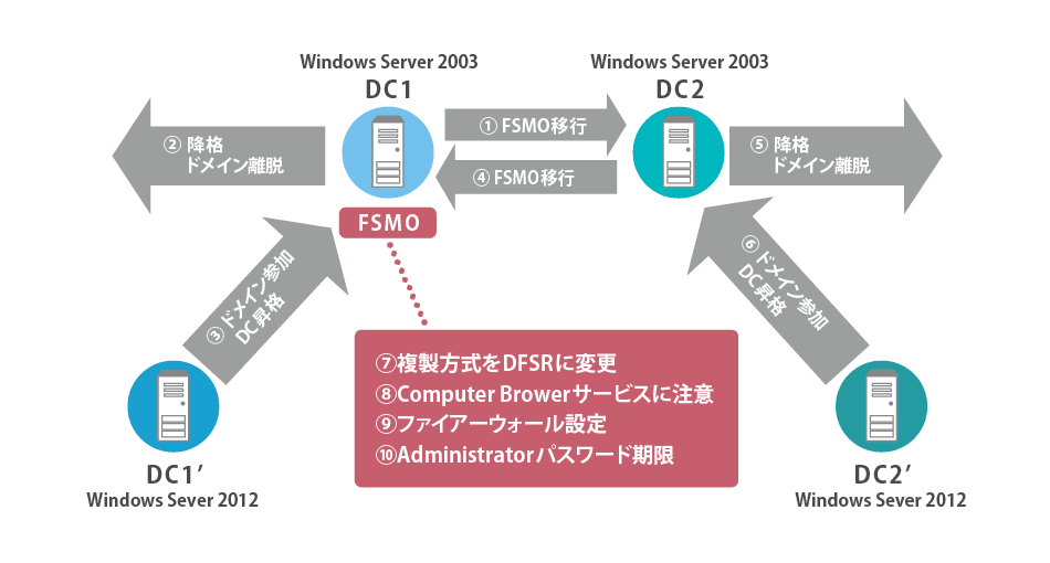 Active Directory サーバのOSをバージョンアップする場合は、Active Directory 以外に変更される機能やアプリケーションにも十分に留意する必要があります。また、バージョンアップ後も Active Directory サーバのIPアドレスやホスト名は、これまでのものと同一に設定しておくと、無用なトラブルを避けられます。Active Directory サーバが複数台ある場合は、1台ずつ降格させてバージョンアップ作業を行い、サービスの停止時間を最小限にするように計画します。