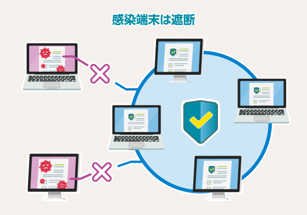 このような被害に遭わないためにも、テレワーク端末にもアンチウイルスのアップデートを強化することが重要です。また、ウイルス感染端末を社内ネットワークに接続させないなど、不正接続を検知・遮断させるための仕組みづくりは即効性のある対策です。