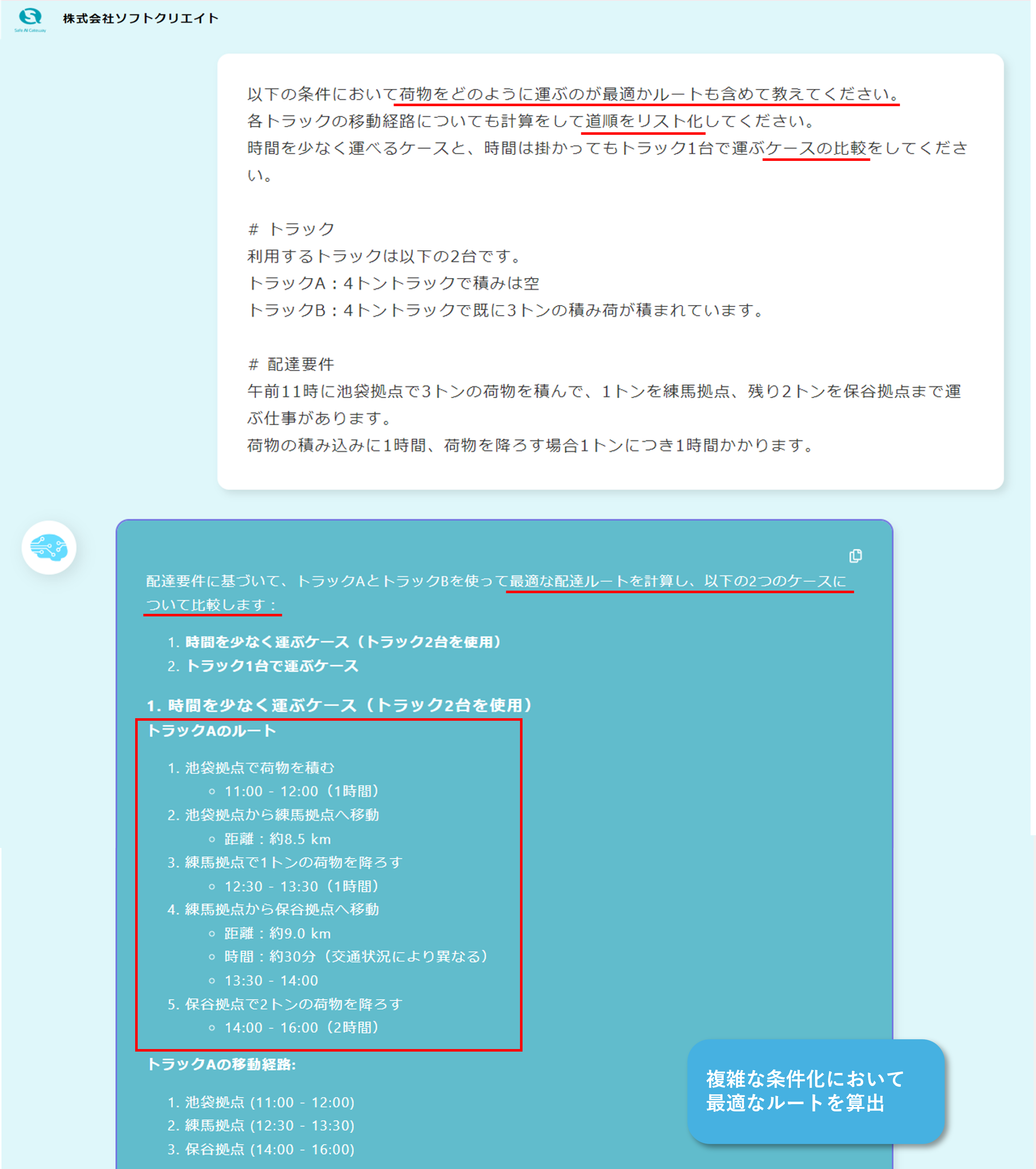 計画にあたって制約条件を増やすことも可能で、積み下ろしにかかる時間や休憩時間を考慮した計画を立てることも可能です。