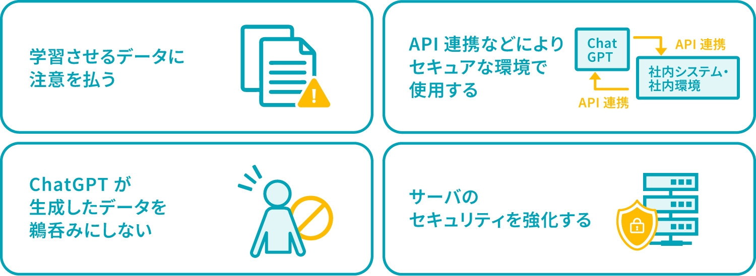 そもそも ChatGPT の利用の有無にかかわらず、セキュリティ対策は必須です。セキュリティ対策ソフトを導入したり、サイバーセキュリティを専門とする企業のアドバイスを受けたりするなど、しっかりとセキュリティが確保された環境で ChatGPT を使用することが重要です。