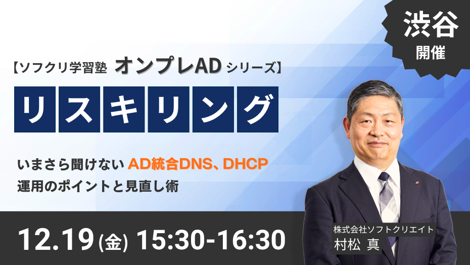 | セミナー名 | 【渋谷リアル開催】ソフクリ学習塾 オンプレ AD シリーズ リスキリング いまさら聞けない AD 統合 DNS、DHCP-運用のポイントと見直し術 |