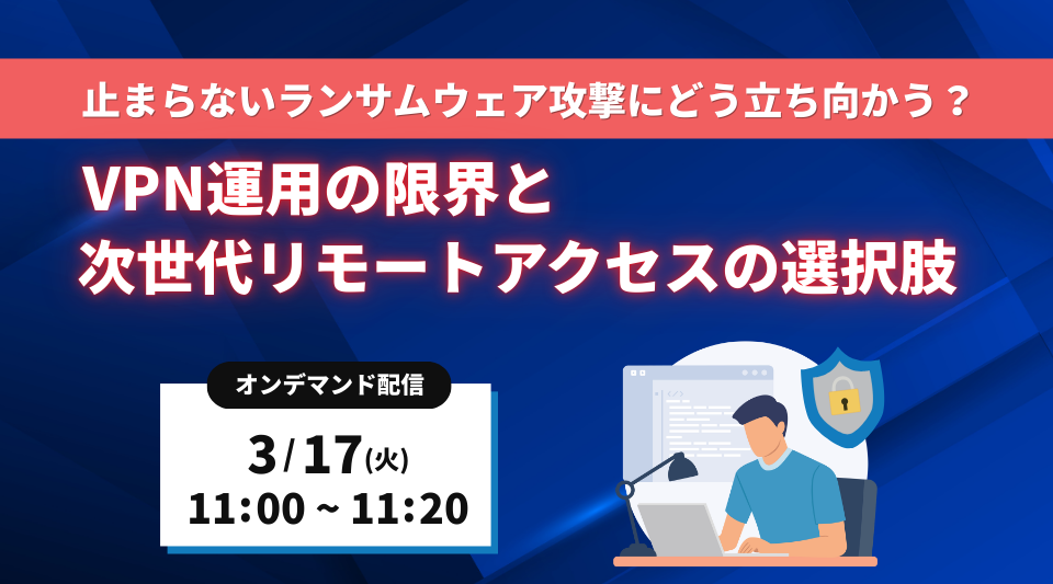 | セミナー名 | 止まらないランサムウェア攻撃にどう立ち向かう? ~VPN運用の限界と、次世代リモートアクセスの選択肢~ |